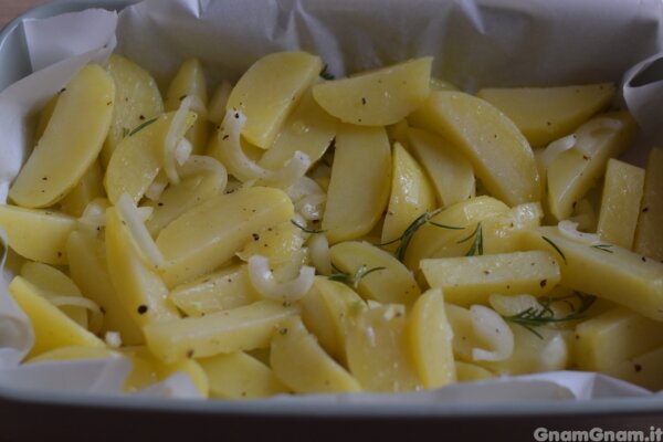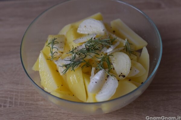 e condiscile con cipolla, rosmarino, sale, pepe e olio. Se le vuoi più leggere, puoi spennellarle con poco olio direttamente in teglia.
