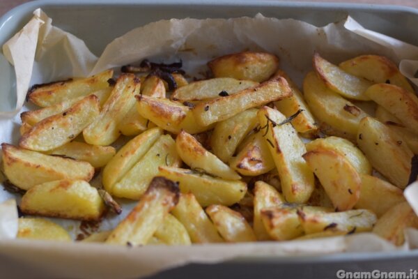 Avrete così delle patate al forno morbide dentro e croccanti fuori. Se le volete più leggere, invece di aggiungere l’olio nella ciotola, potete spennellarlo direttamente sulle patate in teglia.
