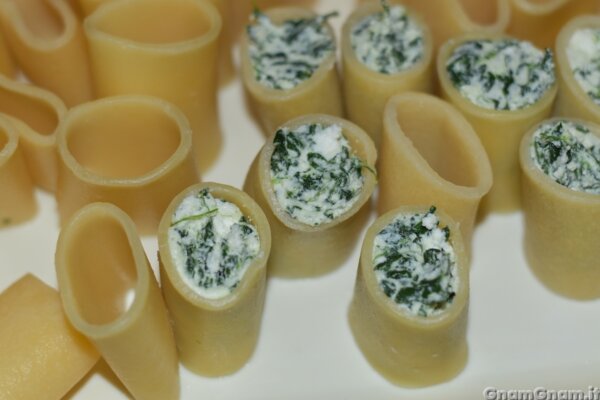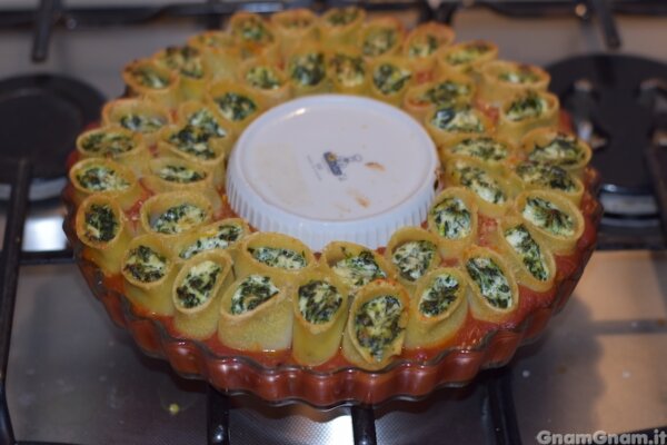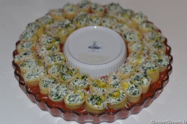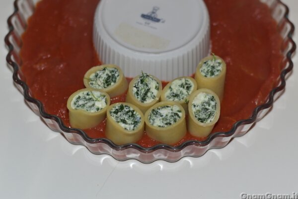 Per il ripieno ho scelto ricotta e spinaci, così da avee anche un colore verde, nonchè una bella ricetta vegetariana. Potete divertirvi a scegliere le farce che preferite, e se vi piace di più, potete sostituire la passata con la besciamella.