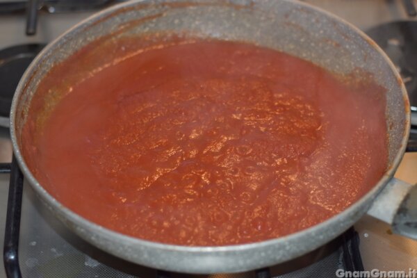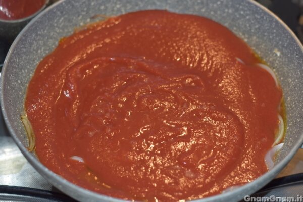 e aggiungete la passata di pomodoro con un po’ di sale.