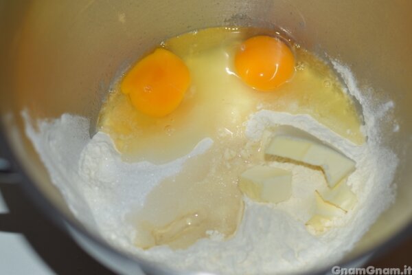 In una ciotola mettete farina, uova, burro, anice, zucchero e aroma alla vaniglia.