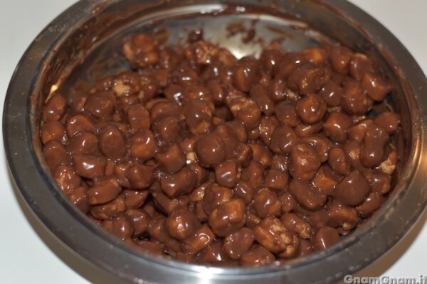 A casa mia non amano il cioccolato fondente, quindi ho usato quello al latte, ma potete tranquillamente usare il fondente o anche quello bianco. Siccome la base è la stessa degli struffoli tradizionali, se volete prepararli entrambi, vi basterà, una volta fritti, tuffarne una parte nel cioccolato e l’altra nel miele.