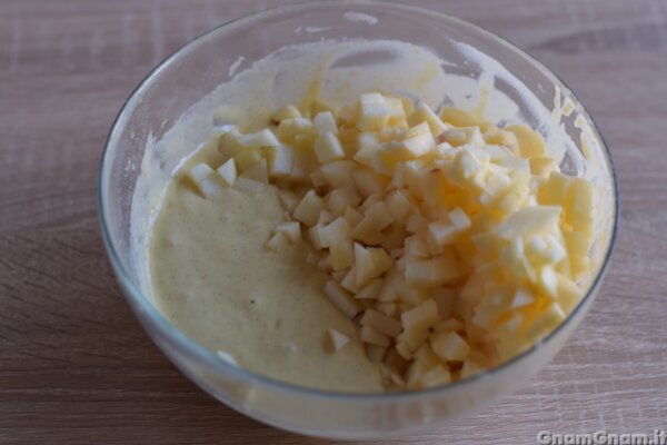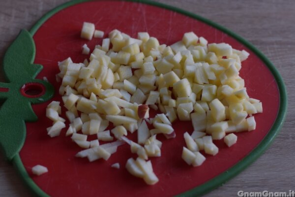Sbucciate le mele, tagliatele a fettine, poi a listarelle e infine a cubetti abbastanza piccoli.