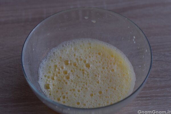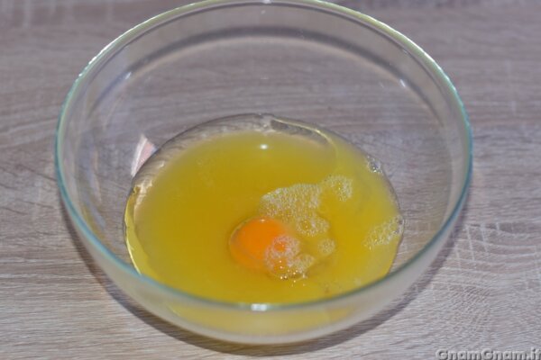 In una ciotola mettete l’uovo, la spremuta d’arancia e l’olio di semi.