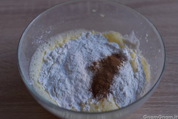 A questo punto aggiungete farina, lievito per dolci e cannella setacciati.