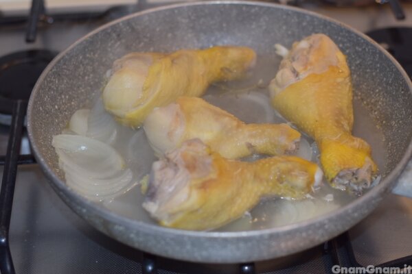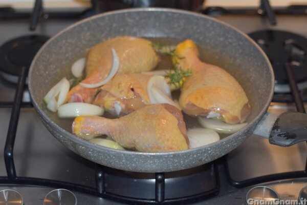 Prendete una padella e aggiungete il pollo a pezzi. Io ho usato le cosce, ma vanno bene quelle che preferite. Unite la cipolla, il rosmarino, il sale, il vino bianco e un po’ d’acqua.