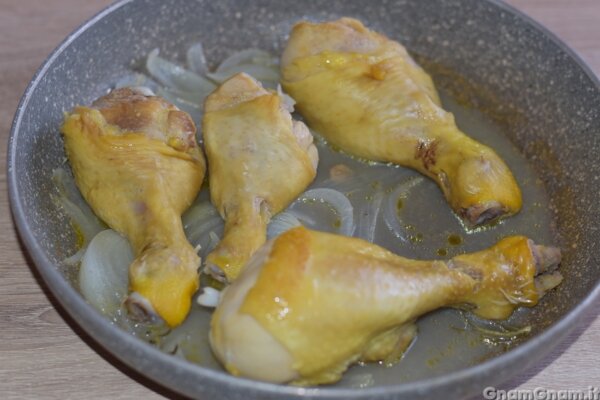 Mettete sul fuoco e cuocete per circa venti minuti con il coperchio, girando il pollo a metà cottura.