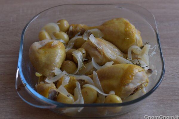 Trasferite il pollo in una pirofila, aggiungete le patate e versate il fondo di cottura. Completate con un filo d’olio